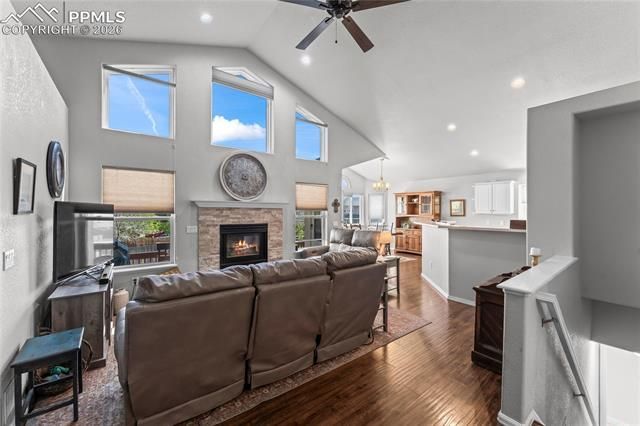 Beautiful Rancher with 5-bedroom, 3-bath, 2-car garage in the desirable Springs Ranch community! This thoughtfully designed floor plan features three bedrooms on the main level and two additional bedrooms in a professionally finished basement (completed in 2024). The main level showcases gorgeous engineered hardwood flooring throughout much of the space, soaring vaulted ceilings in the bright and open great room, abundant natural light from large windows, and a cozy gas log fireplace. The great room flows seamlessly into a spacious dining area with picturesque views of the expansive backyard. The kitchen is well-appointed with stainless steel appliances and a generous corner pantry. The primary suite offers vaulted ceilings, engineered hardwood floors, large windows overlooking the backyard, and a private 5-piece bath with ceramic tile flooring, dual vanities, freestanding shower, oval soaking tub, and a walk-in closet. The finished basement provides a large family room ideal for a fitness space, media area, or game room, along with two sizable bedrooms and a stylish 3/4 bath featuring modern tile work. Garden-level windows bring in plenty of natural light. Step outside to a large covered deck—perfect for entertaining, grilling, or relaxing—overlooking a tremendous fenced backyard with a sprinkler system. Additional features include central air conditioning. Conveniently located near Peterson Space Force Base, Powers Boulevard shopping and dining, and with easy access to the Colorado Springs Airport.
